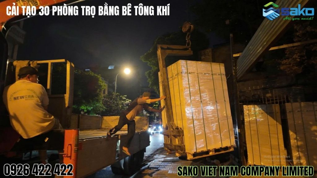 Để kịp đưa 30 phòng trọ vào vận hành đúng kế hoạch, công tác xuống hàng và vận chuyển gạch AAC thường được thực hiện vào ban đêm để tránh ùn tắc giao thông tại khu vực trung tâm.