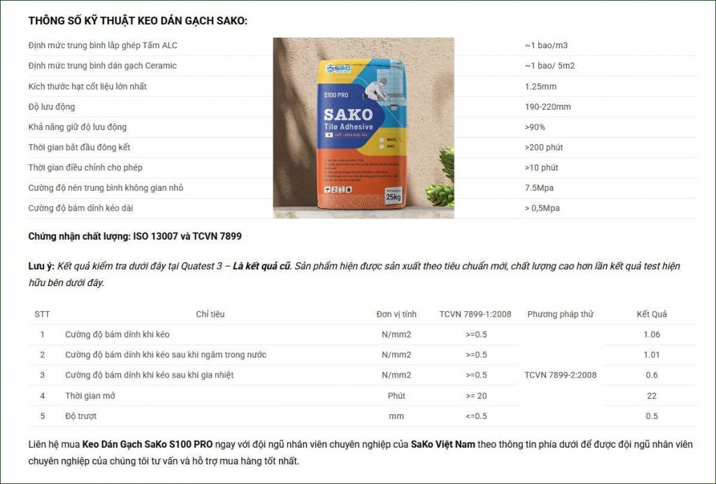 Hình ảnh 3: Thông số kỹ thuật Keo dán gạch SAKO S100 PRO 25kg/bao cao cấp.